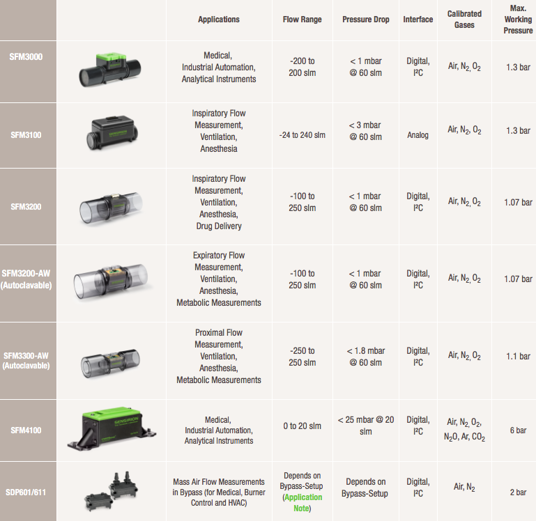 Sensirion offers mass flow meters for diverse applications. Please find in the table below all our standard products. Furthermore, we also develop customized sensor solutions.