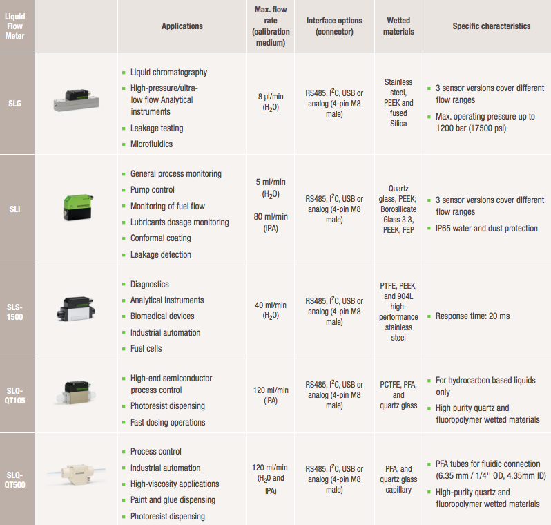 With a calibrated flow rate range of up to 120 ml/min, dual calibration for water and IPA, and the exclusive use of high-purity wetted materials (only quartz glass and PFA), this sensor is ideal for dispensing applications in demanding environments, such as the semiconductor industry. Its excellent chemical compatibility makes the SLQ-QT500 the first choice for measurement of even aggressive chemicals and its larger inner diameter for the measurement of highly viscous liquids.